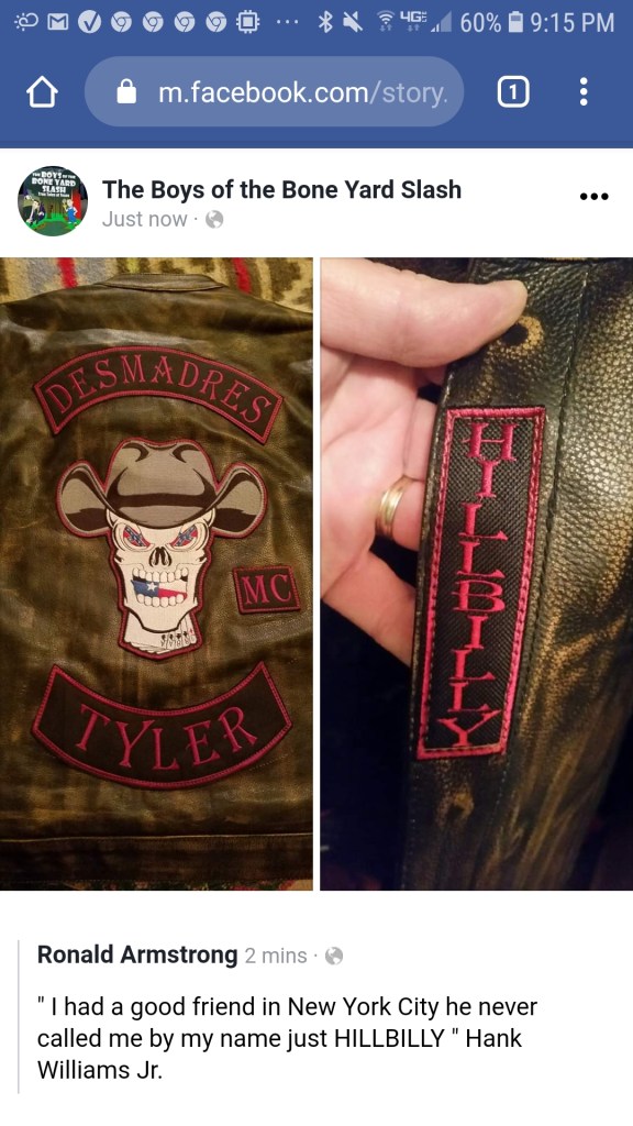 Wind therapy is awesome! If you’ve never tried it you might want to start. Riding my Harley lowers my blood pressure and works every part of your body its addictive and when you have some solid Brothers that you enjoy riding with and being around it makes it that much better. Here in East Texas we are blessed with a lot of good roads to ride and that goes for all of Texas. You can slide on up to Oklahoma and Arkansas and we have access to even more good riding and beautiful scenery. If you’ve never experienced sitting on a frame balanced on two wheels with five gallons of gas between your crotch and rolling eighty miles an hour then brother you ain’t lived! Side by side tire to fender with your Brothers or all alone with the wind and your thoughts either way it will rejuvenate your soul and renew your mind, it will make the world seem like a better place. There’s nothing like it ! You smell the world around you, fresh cut hay, fresh plowed earth, honeysuckle, mountain air, pine trees and yes there is an occasional dead skunk in the road but that’s all part of the experience. Throw in a tent and an over night camp out at a run with no cares and worries for a day or two and your ready to face the world again. Or if you can just take a thirty minute ride down the road from your house it works wonders. Keep your head on a swivel and watch for folks that ain’t watching for you though! Here’s to all my Brothers in the wind and those that maybe someday will be. And to all my Brothers in my M/C, Love ,Loyalty and Respect to the DESMADRES M/C. LOVE ALL Y’ALL, Hillbilly